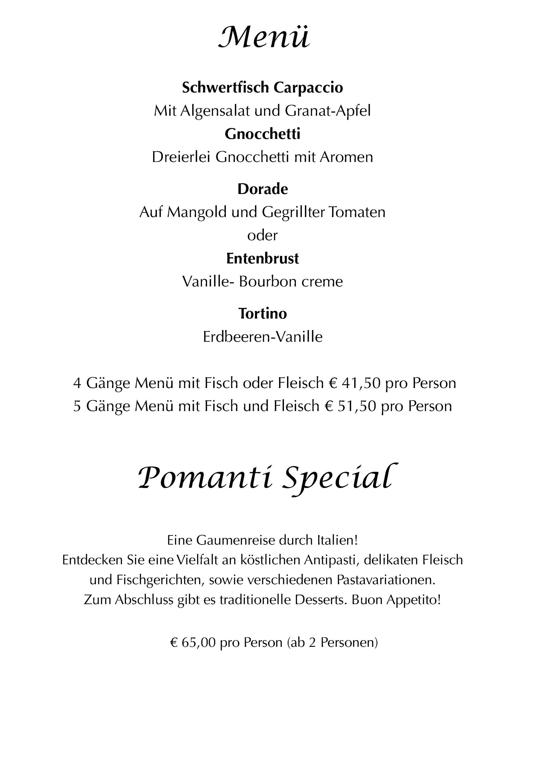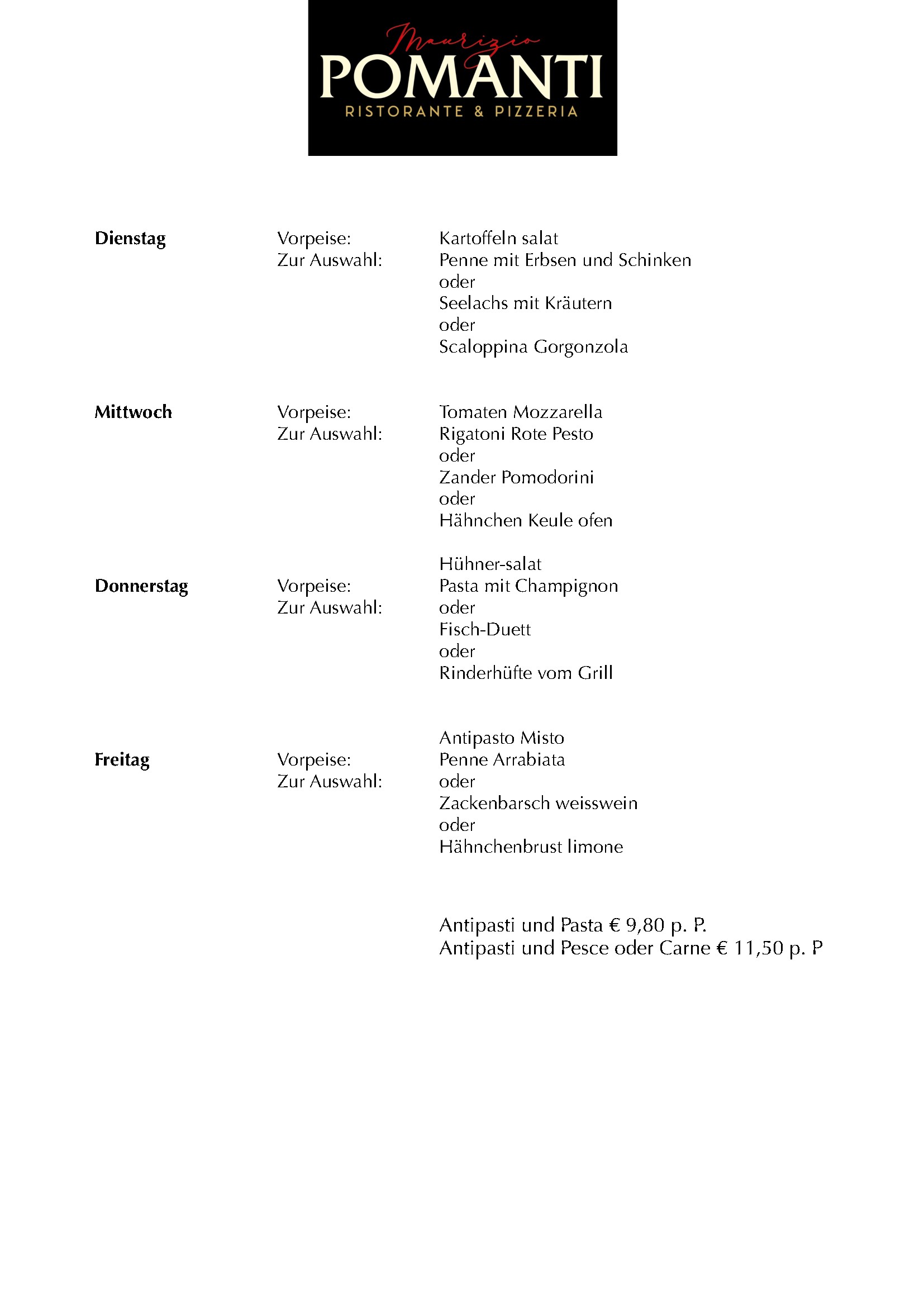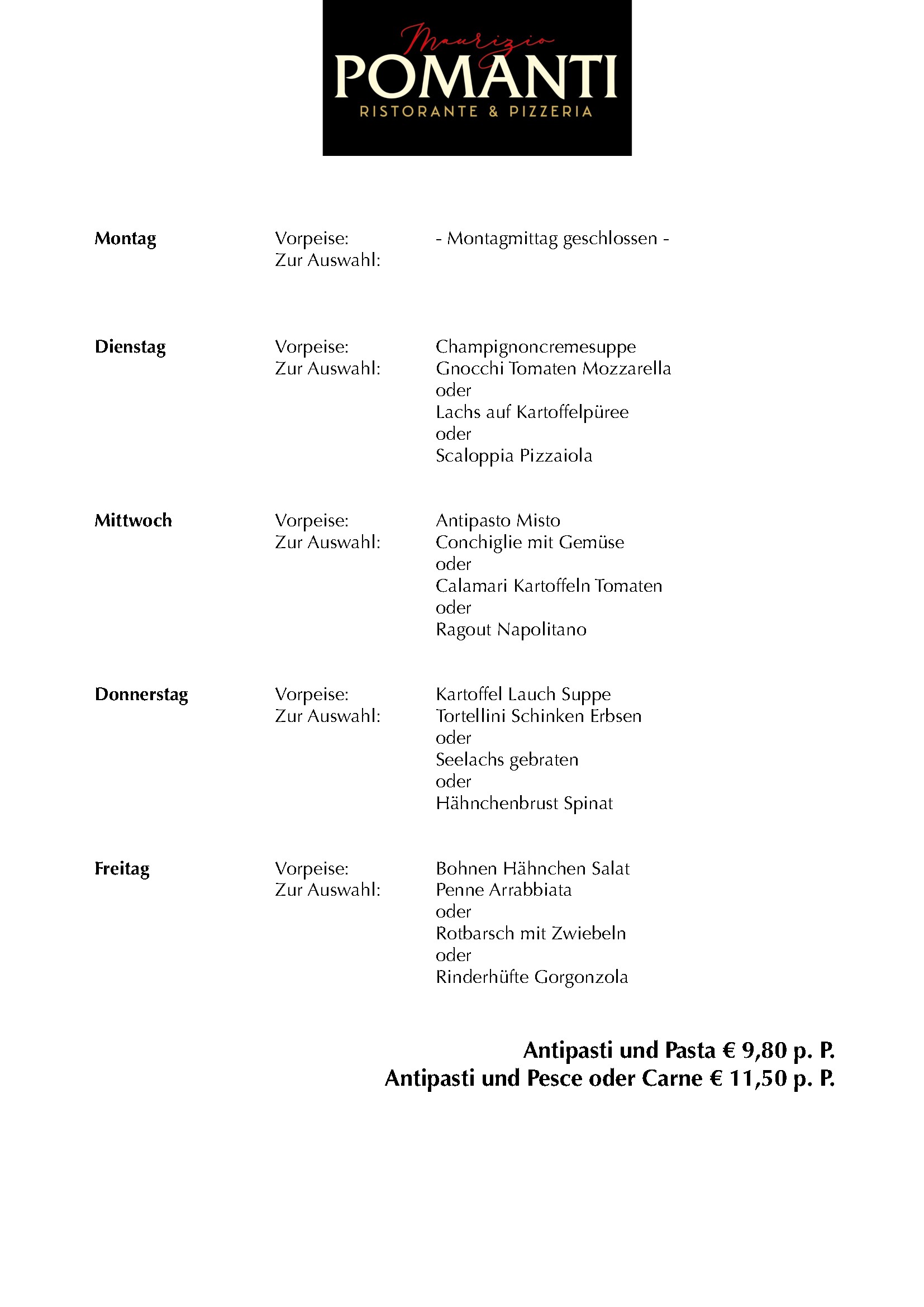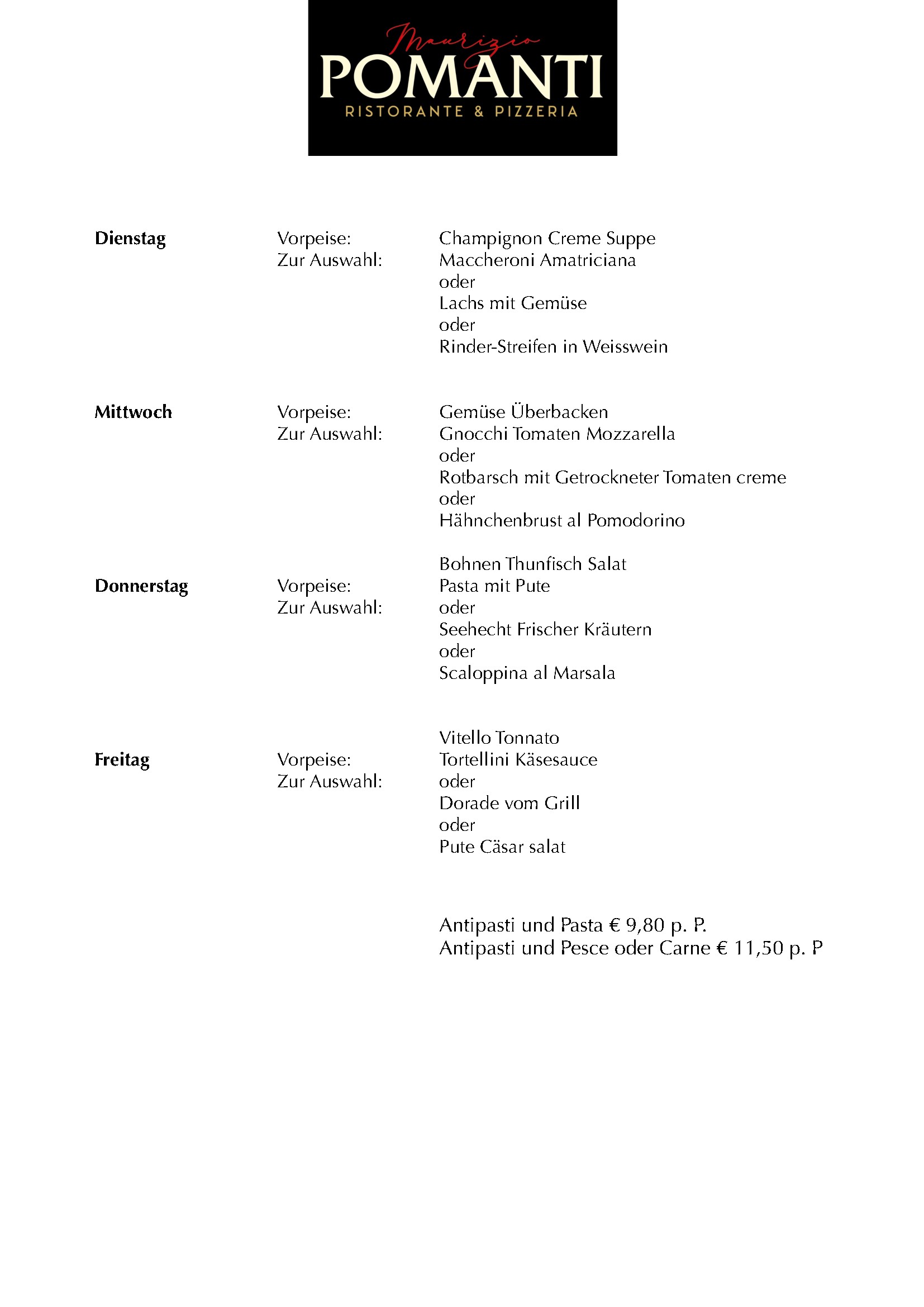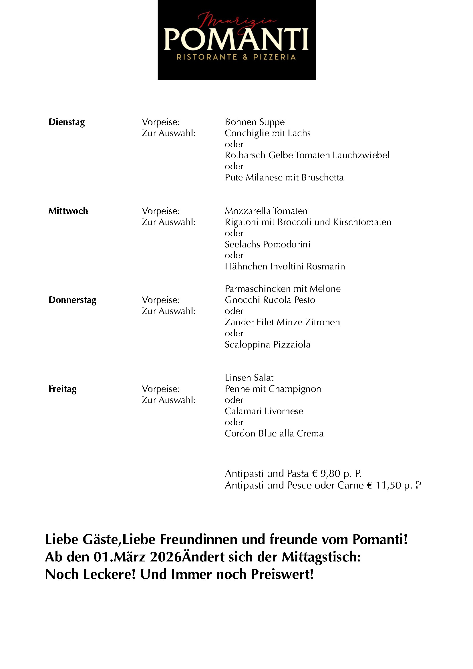 Liebe Gäste, liebe Freundinnen und Freunde von Pomanti!Ab dem 1. März 2026 bieten wir Ihnen einen neuen Mittagstisch an:Freuen Sie sich auf eine größere Auswahl jeden Tag. Wie gewohnt lecker und preiswert!